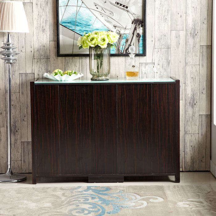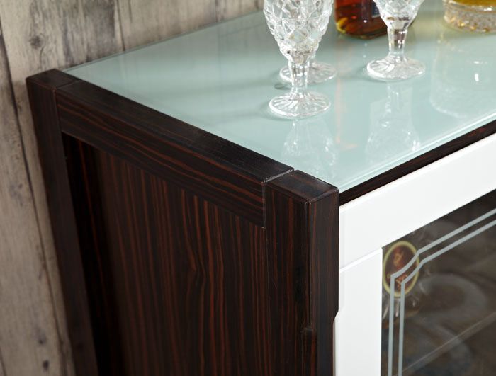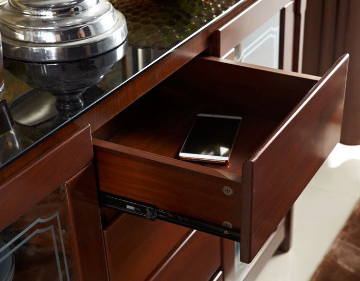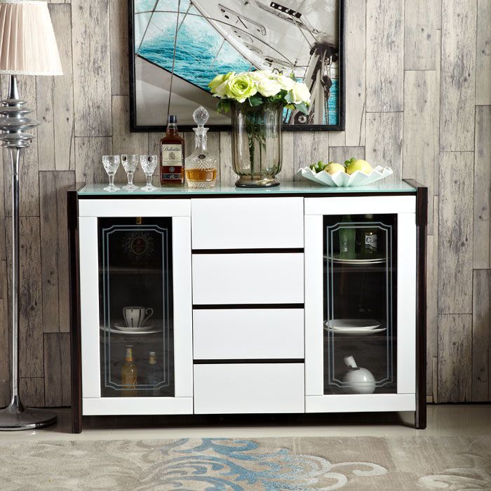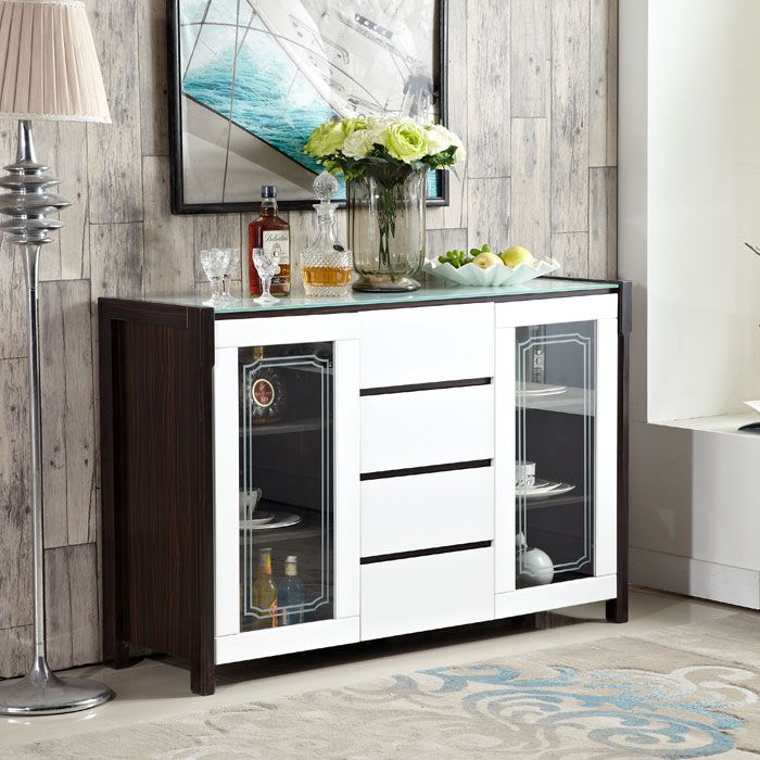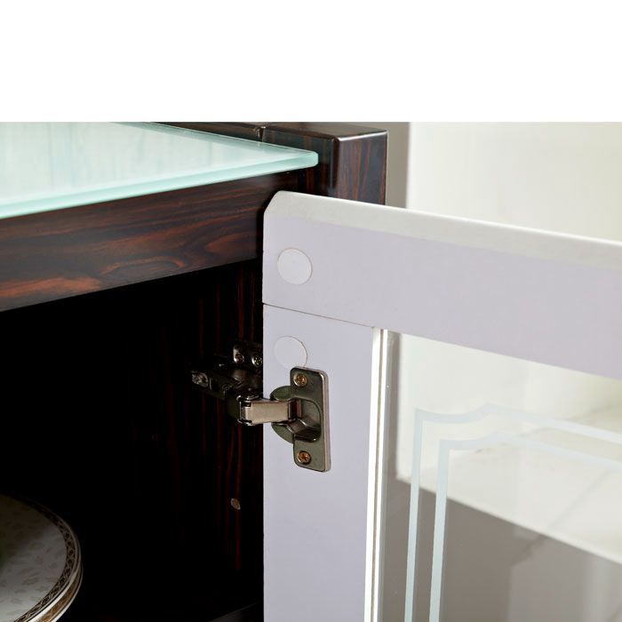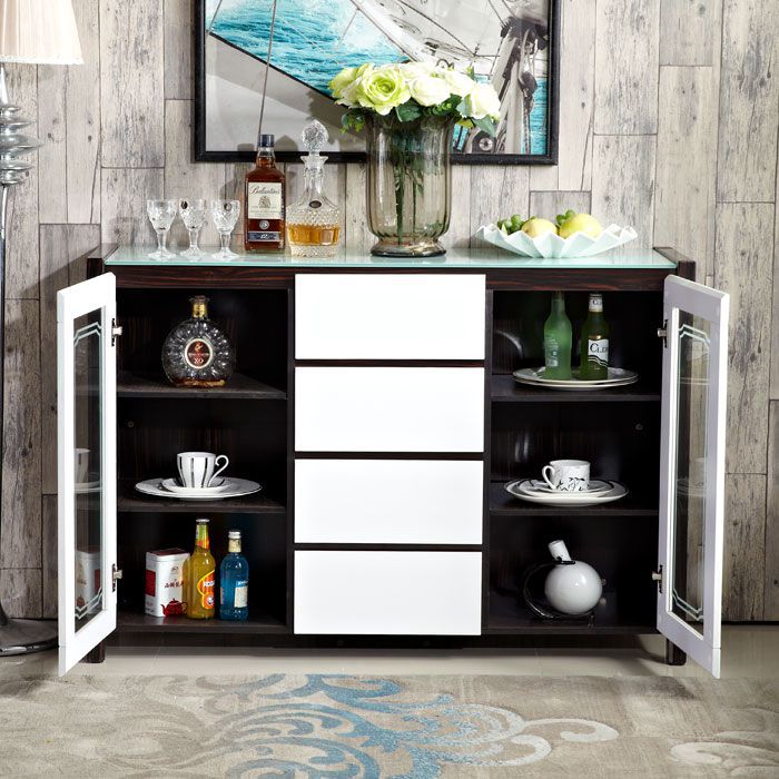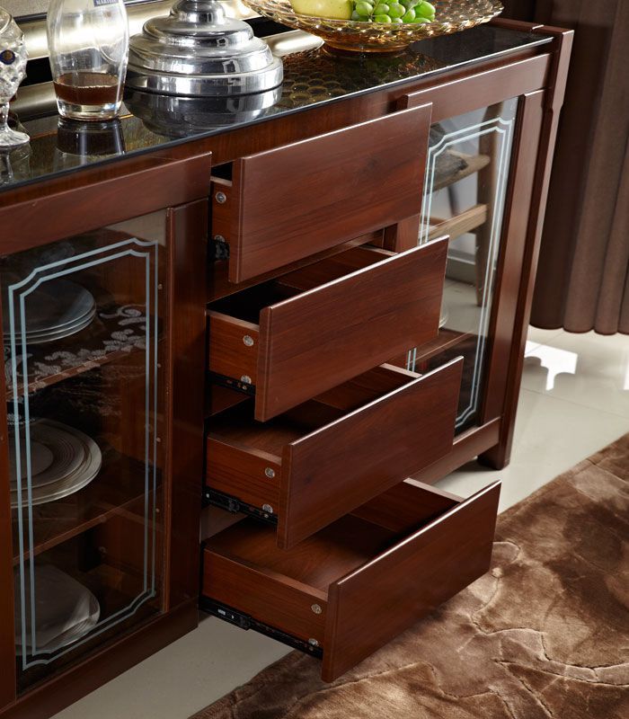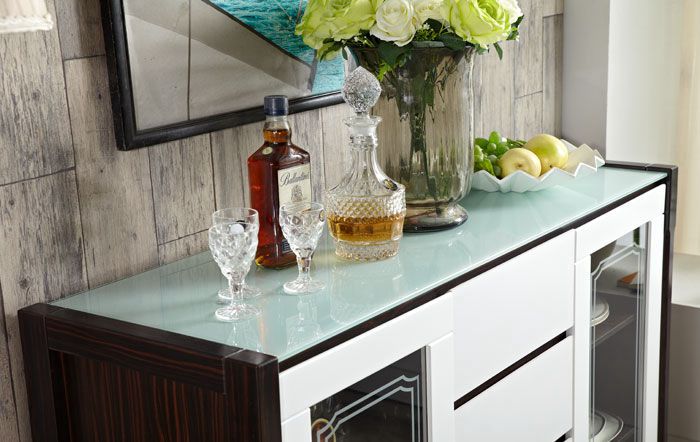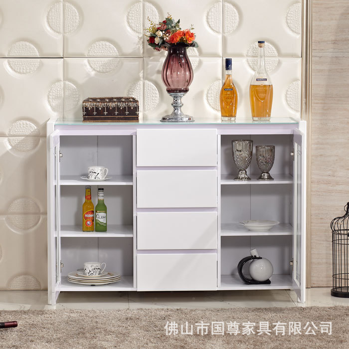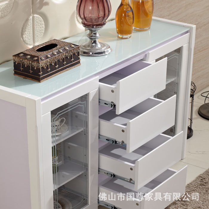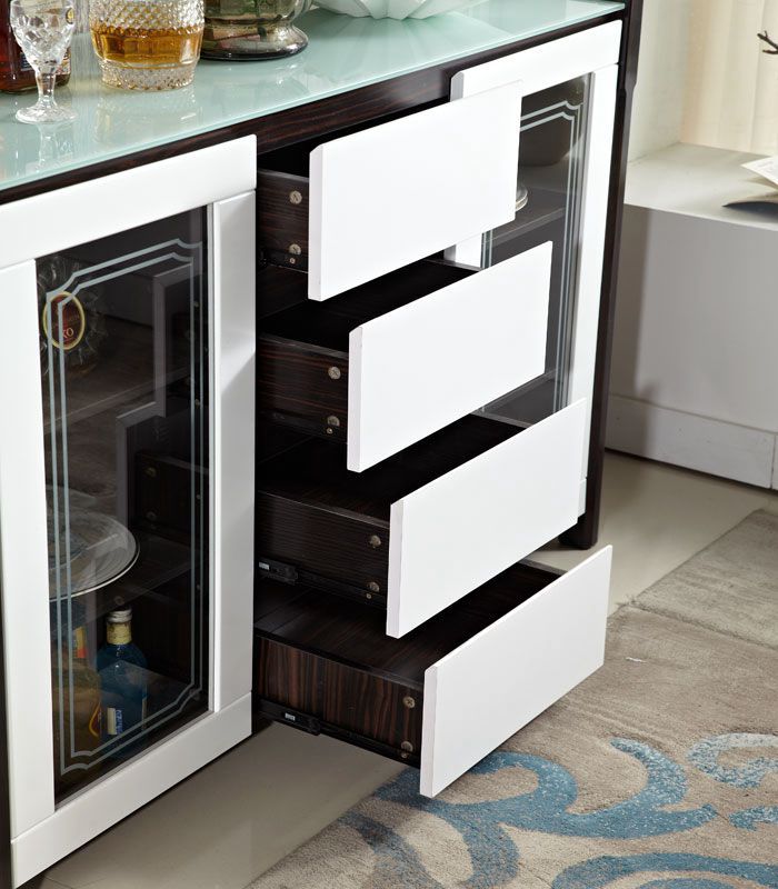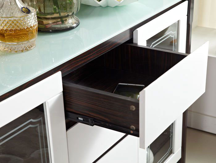 构造:带玻璃的柜顶(带黑色不透明玻璃的柚木色餐柜,带白色不透明玻璃的其他色餐柜),中部4个抽屉(三段式滑轨),左侧和右侧的玻璃推拉门(已安装)在门的顶部)油压门铰链,有着缓冲效用),三层有两个隔断,这些隔断是可移动的,可以自由置于或调节高度。门板上的隐藏式把手是开启的。高档大方,美观实用。