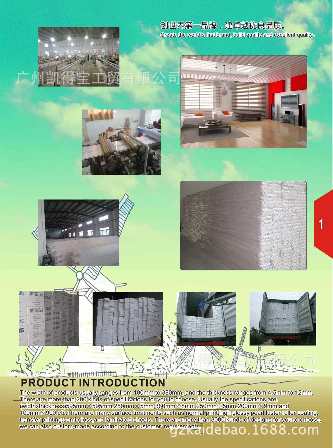 广州凯得宝工贸有限公司,专业研发和生产室内装饰材质(pvc吊顶,pvc扣板,保丽龙天花板,金属天花板,墙板,pvc折叠门,压纹三维皮包等),我们的公司是生产和贸易综合性综合公司。公司的主要生产地点座落广东广州和浙江老厂。欢迎所有新老客户前来咨询!