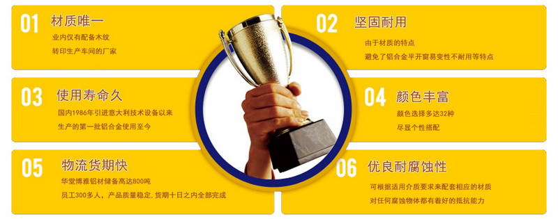从式样的设计到原材料的选择, 华堂博雅门窗有限公司使用中国十种闻名品牌的硅镁铝材质,然后结合独特的表面处理喷涂,真空木纹,工艺玻璃喷砂和电脑雕刻技术,专业技术人员的精致加工,无论在式样,质量,技术和风格上,都可以处于趋向领先地位。它是许多星级酒店,高端楼盘和华丽家居的首选。