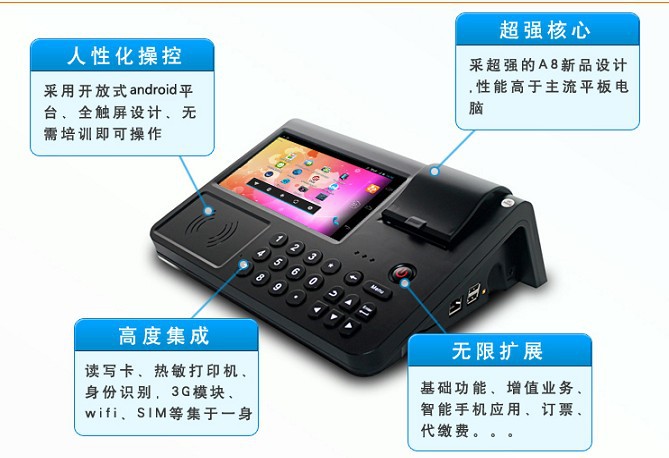 配置:3g,有线互联网,RFID,PSAM,相机,打印机,无线wifi,支持外部第二代id卡识别读卡器