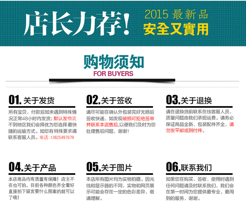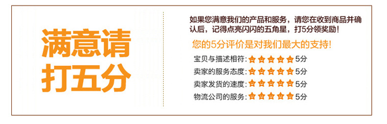 3由于我们无法支配物流公司,有时由于天候,路况等因素致使货物耽误,请买家体谅,收货时请检查货物。如果有任何损坏,请回绝收货,即时通知卖方,并在物流单上注明,我们将即时处置,并且不会要求买方损失任何东西,例如签字的收据或我们对损坏不承担任何义务!有关更多信息,请联络旺旺customerservice,多谢!